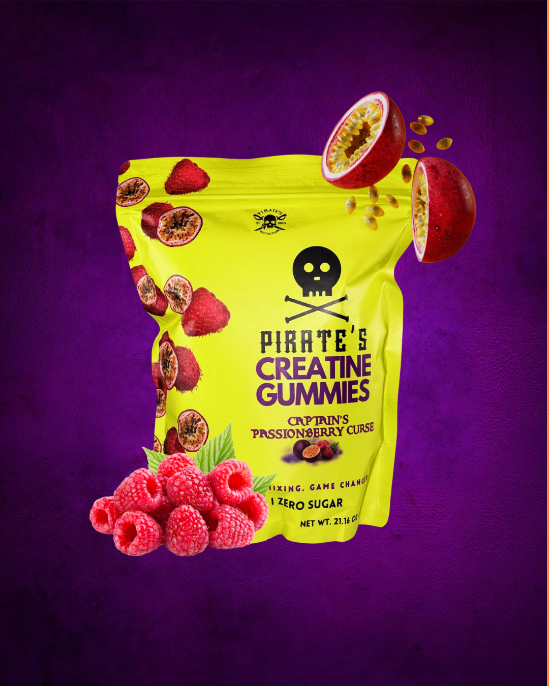 Captain’s Passionberry Curse isn’t just a gummy, it’s a tropical explosion of pure creatine power, wrapped in sweet passion fruit and berry madness.